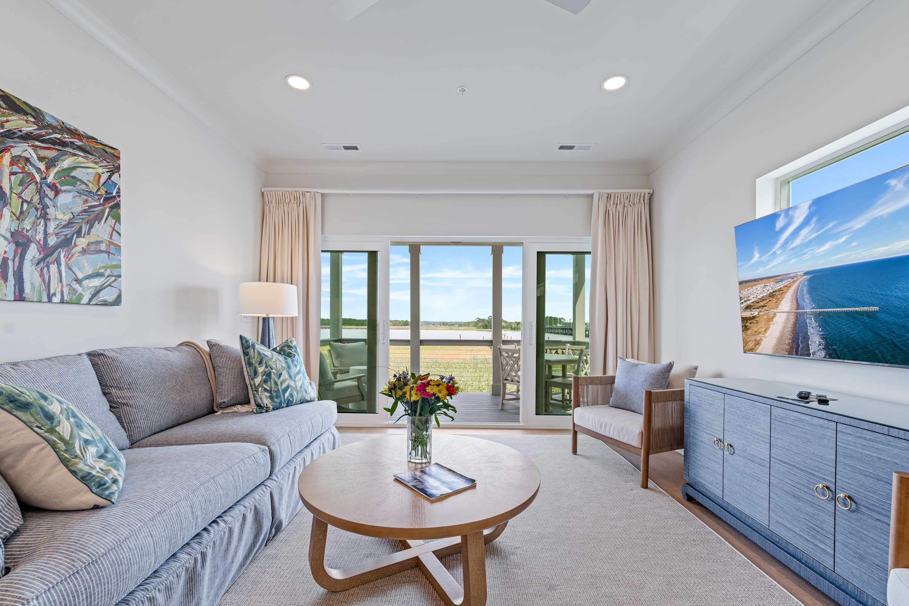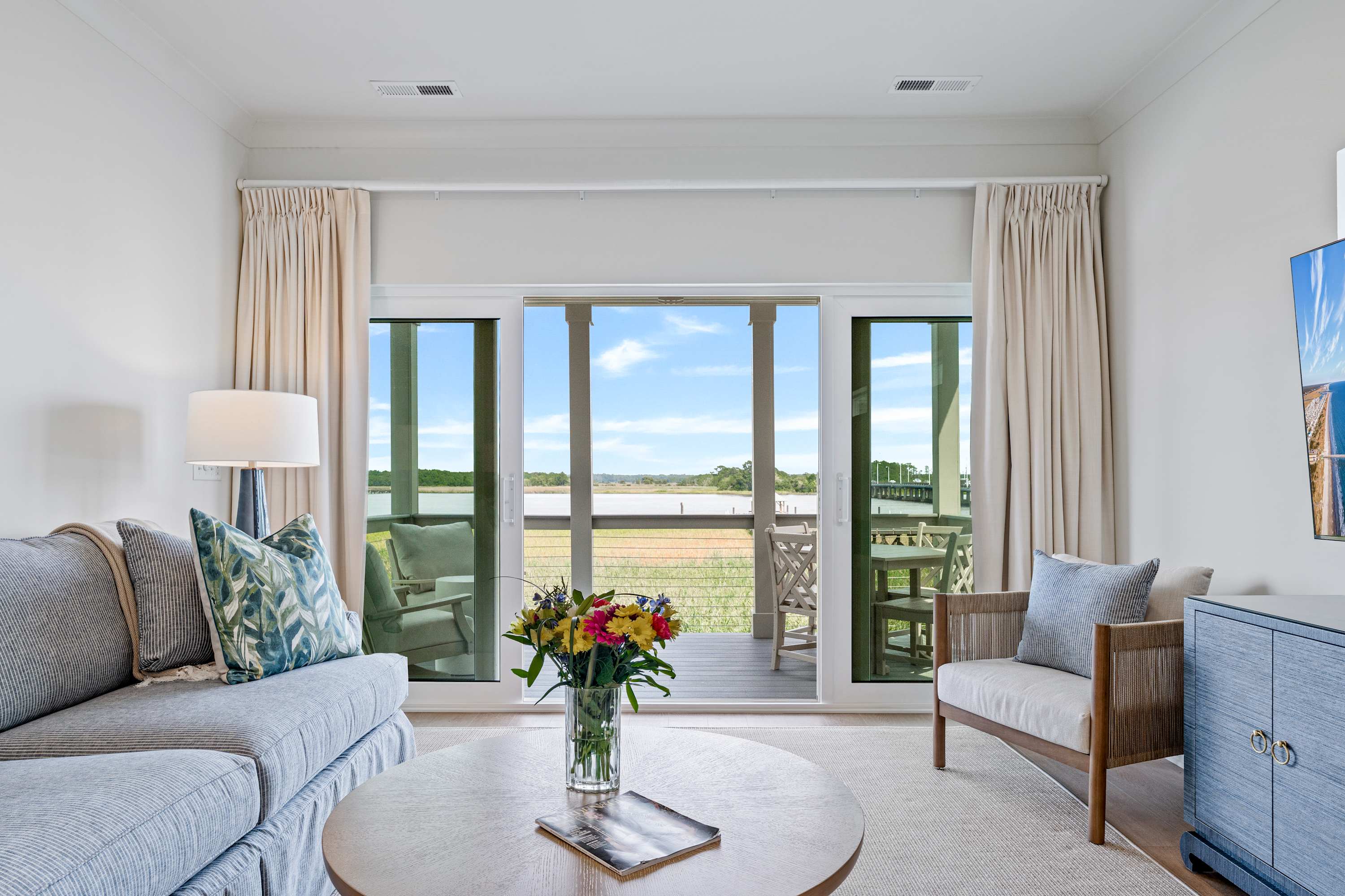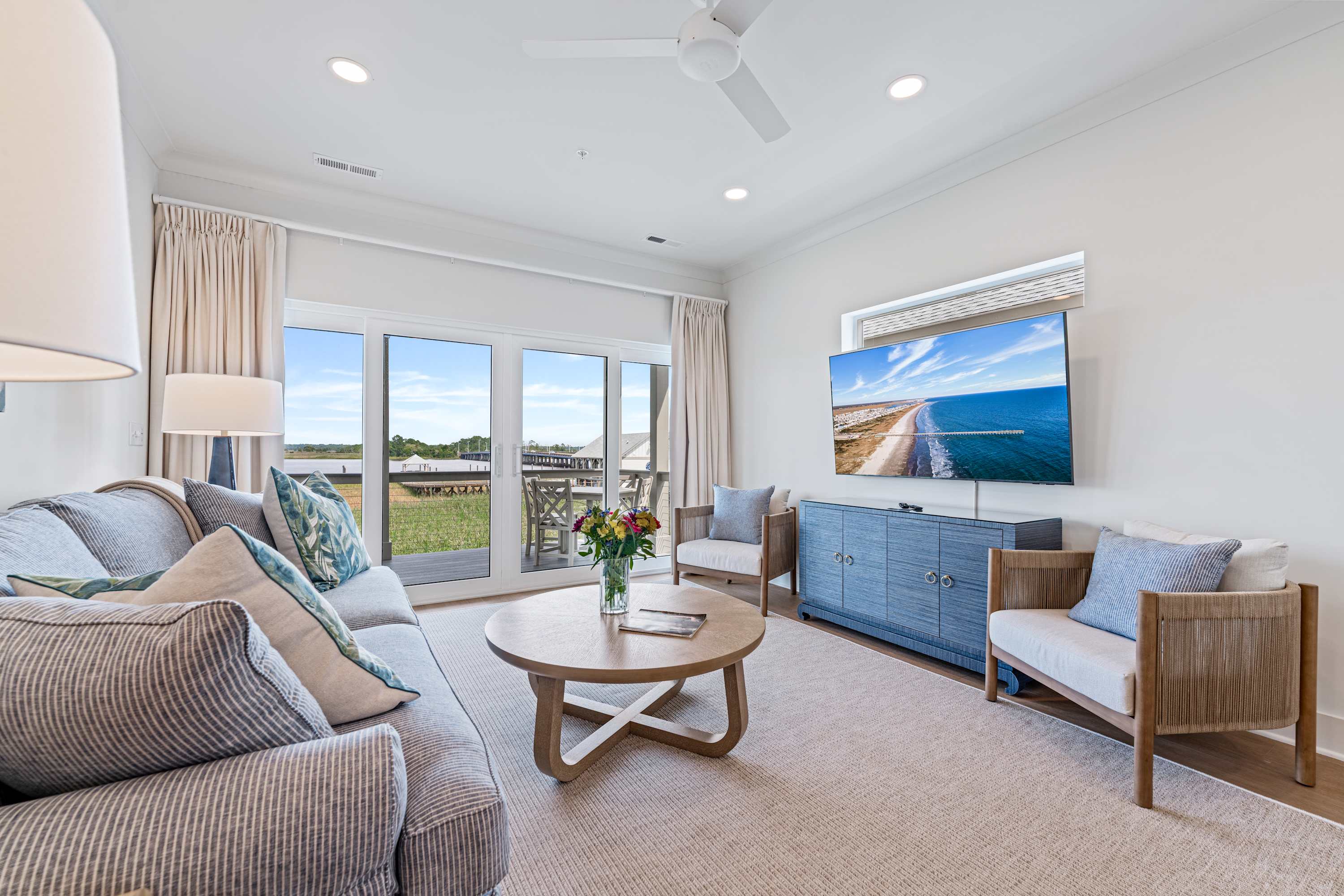 Winyah Bay Club features 17 stylish, individual cottage units, each ideal for large wedding parties, golf enthusiasts, and families. This cottage offers 2 spacious bedrooms (the master has breathtaking water views) and 2.5 baths. The open-plan living room, kitchen, and dining area on the second floor are designed to maximize the stunning waterfront vistas, making every stay memorable and luxurious.